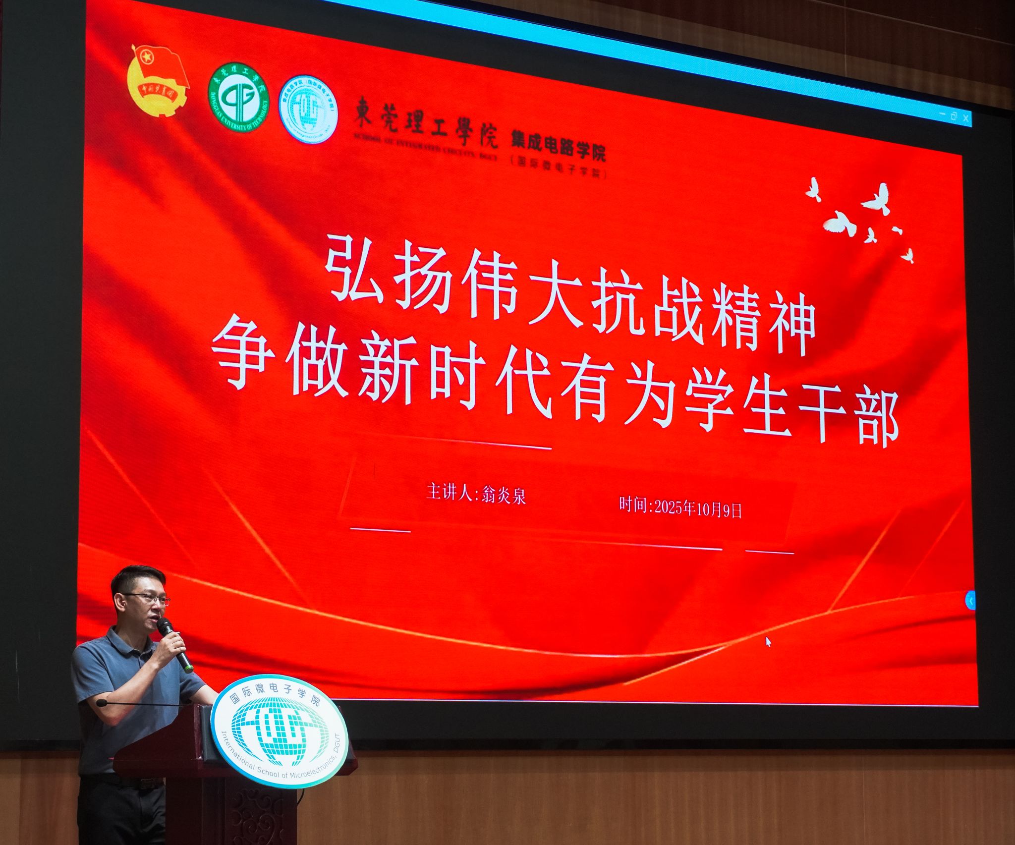 翁书记围绕“弘扬伟大抗战精神,争做新时代有为学生干部”为主题,指出抗战精神是中华民族的精神脊梁,青年学生干部要深刻领会其“爱国情怀、民族气节、英雄气概、必胜信念”的核心内涵,在角色中找准“服务者、领头雁、实干家”的定位,将精神力量转化为服务同学、引领成长、担当使命的实际行动,在新时代的长征路上书写青春担当。