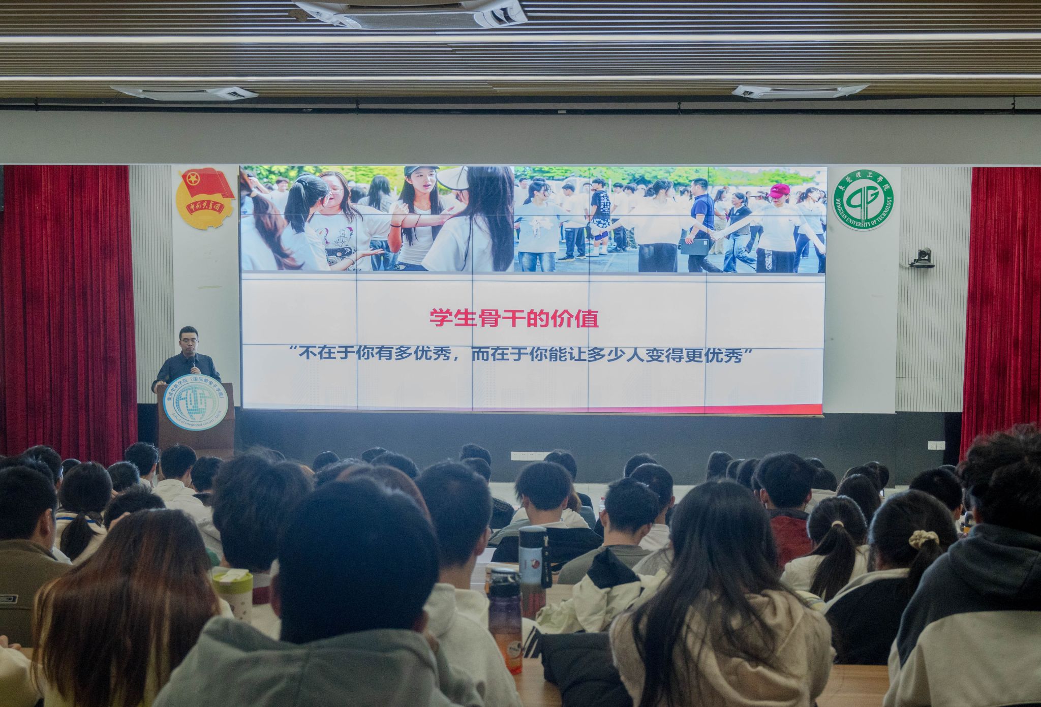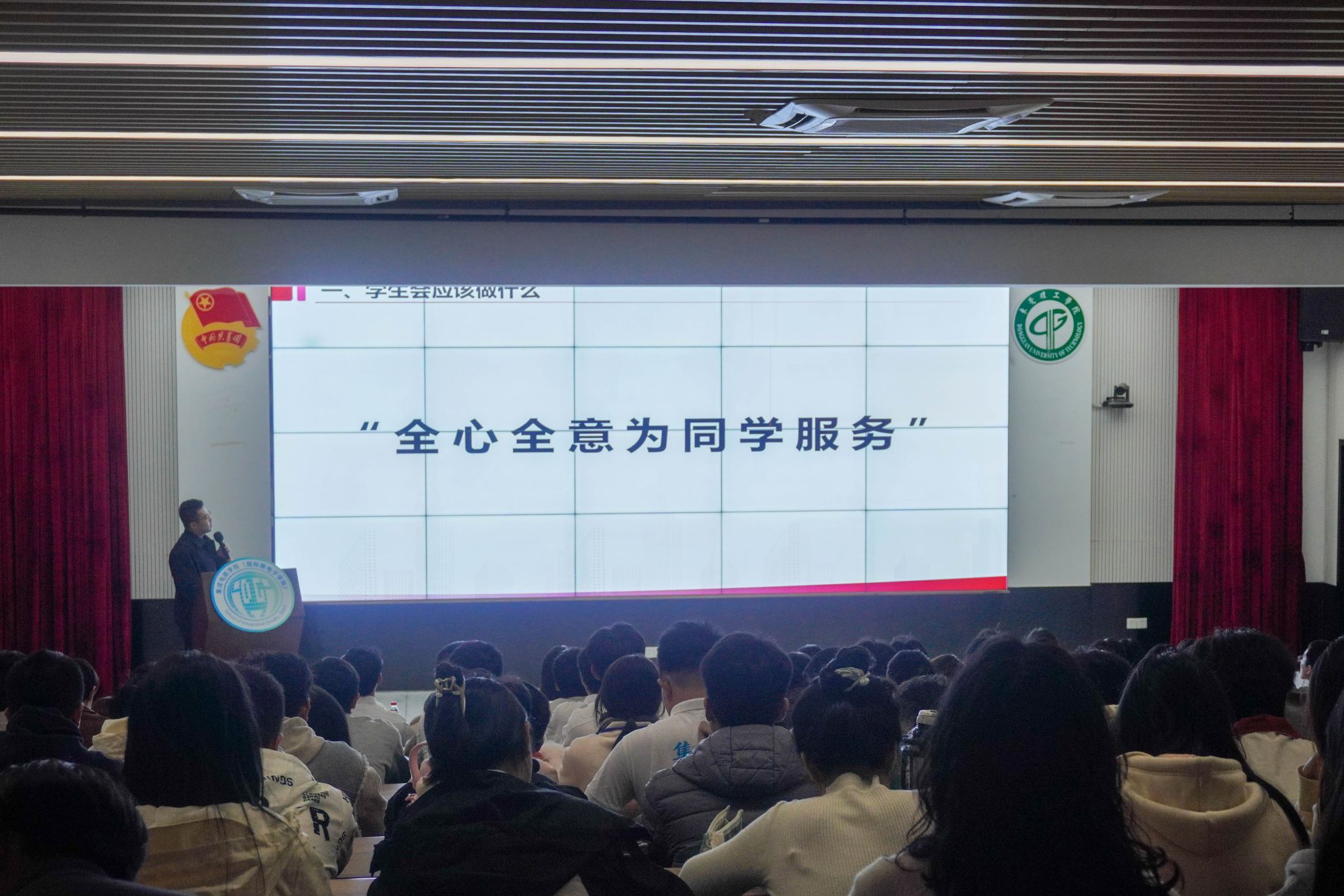 贾彬老师在讲话中围绕学生骨干的职责与定位进行了阐述。他指出,学生组织是在党领导下连接学校与同学的重要桥梁,必须坚持以服务同学为根本宗旨,坚决抵制官僚主义等不良风气,严格遵守学校相关规定与学生手册要求。同时,贾彬老师强调,学生骨干不仅是学长学姐,更是落实育人“最后一公里”的关键力量、构建成长“信任链条”的核心纽带。学生骨干应在学业、品德、担当精神等方面率先垂范,通过真诚服务与奉献实现个人价值,在助力他人成长的同时成就自我提升。