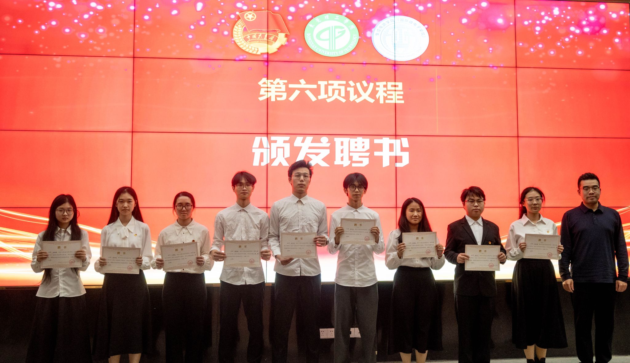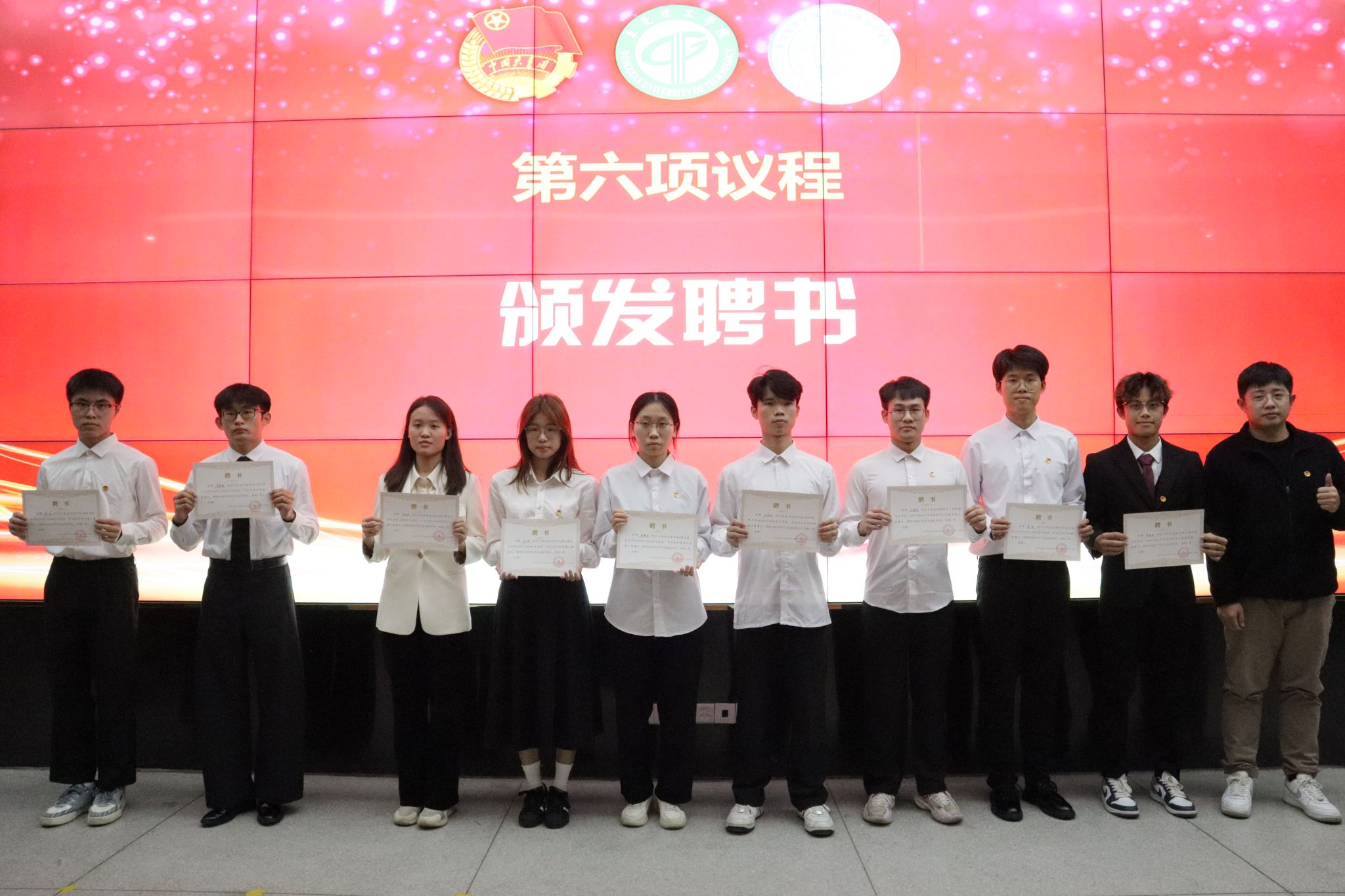 大会第六项议程,由贾彬老师和魏锋老师为各部门负责人颁发聘书,勉励各位同学在下一年度的团学工作中再接再厉,持续提升。